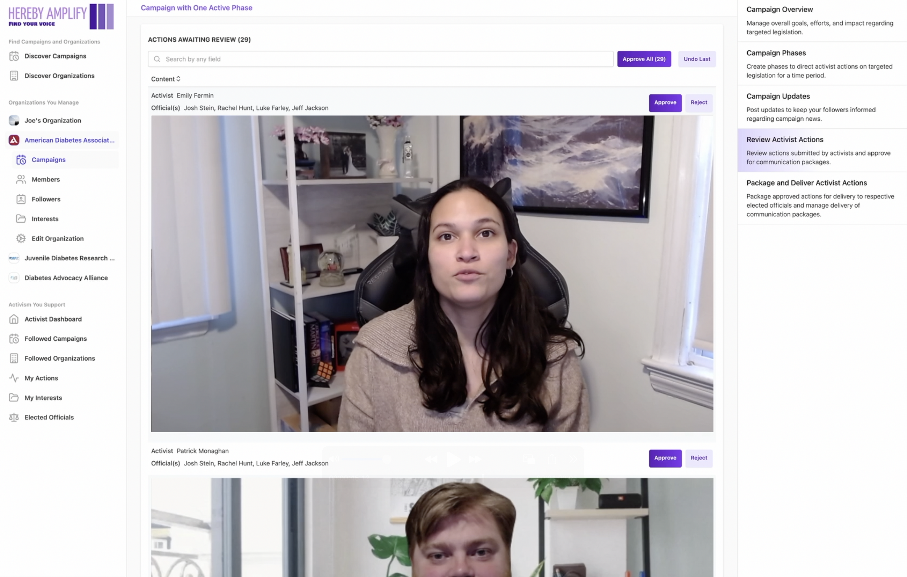 Hereby Amplify repositions Organizations as the mediary between activists and elected officials for grassroots lobbying at every legislative step at all levels of government. Organizations guide activists and collect their messages for review, then deliver those pointed messages to elected officials in batches for maximum and efficient impact.Email, Phone, Social, and Video
